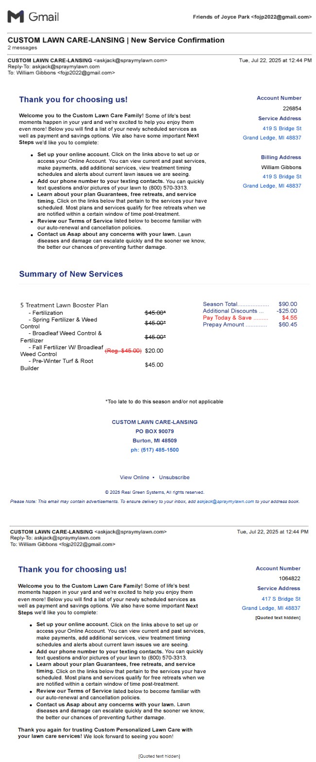 as from Custom Lawn Care-Lansing to the Friends of Joyce Park email