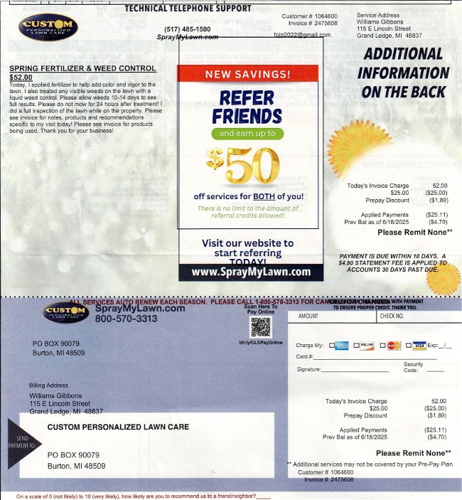 be sent to both addresses I have for Custom Personalized Lawn Care.