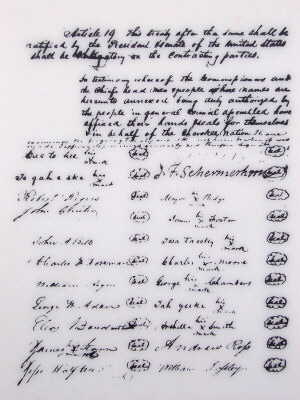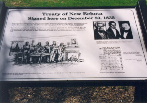 "Some Cherokees believed removal west was unavoidable. Supporters of removal met with U.S. government officials at New Echota and on December 29, 1835 twenty Cherokees signed the Treaty of New Echota. It relinquished title to all Cherokee lands in the east in exchange for $5,000,000 and a tract of land in what in now Oklahoma. Most Cherokees considered the treaty fraudulent since it was never approved by the Cherokee Council. By a one vote margin the treaty was ratified by Congress and signed into law by President Andrew Jackson. In 1838 the U.S. government used the treaty as legal justification to forcibly evict the 15,000 Cherokees who remained in the east." |