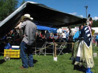 I mentioned the elders tent on page one. If you have not picked up on it from some of the images so far, let me share with you that it was indeed a "Winnie the Pooh" blustery kind of day. Every so often a wind gust would lift somebody's tent up just enough to inspire them to quickly grab it and secure it a little better. However, the elders tent did not fare as well. Apparently, after a few mishaps they decided it could not be properly secured because they started dismantling it around a quarter to two that afternoon. The elders joined us in the visitors area, which as it turned out, being right next to the announcer's building, was quite adequately anchored to a telephone pole. |