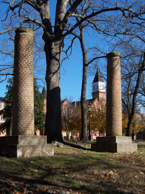 My opening photo on this page shows what today is "Seminary Hall" called the "centerpiece" of the NSU campus. The picture at right, found on the Internet, shows it when it was indeed the Cherokee Female Seminary. The picture below right is also from the current NSU campus, but I am not sure what the columns are from. However, the photo I took below left is from the Heritage Center grounds. Those columns are from the First Female Seminary, which is also shown in an Internet photo (center). |